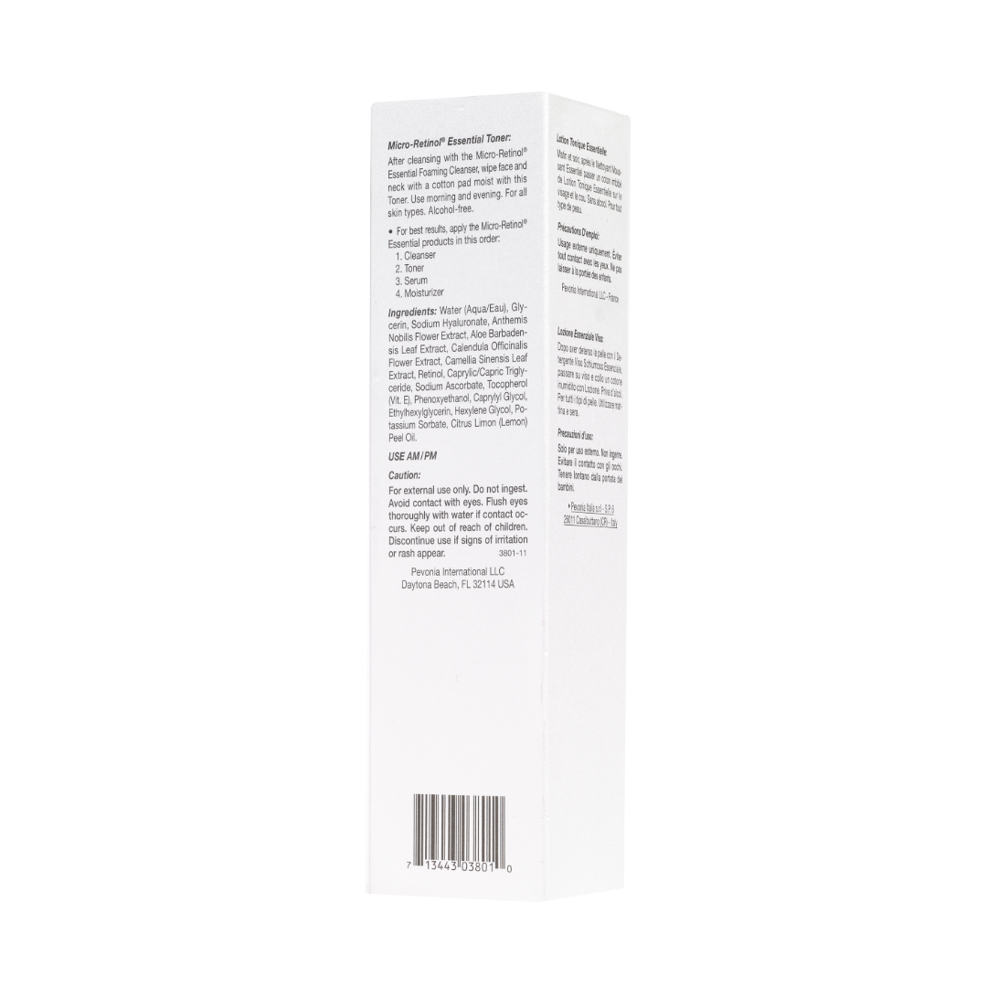 After cleansing with the Micro-Retinol Essential Foaming Cleanser, wipe face and neck with a cotton pad moist with Micro-Retinol Essential Toner. Use morning and evening. For all skin types. Alcohol-free. For best results, apply Micro-Retinol Essential products in this order: 1. Cleanser 2. Toner 3. Serum 4. Moisturizer.